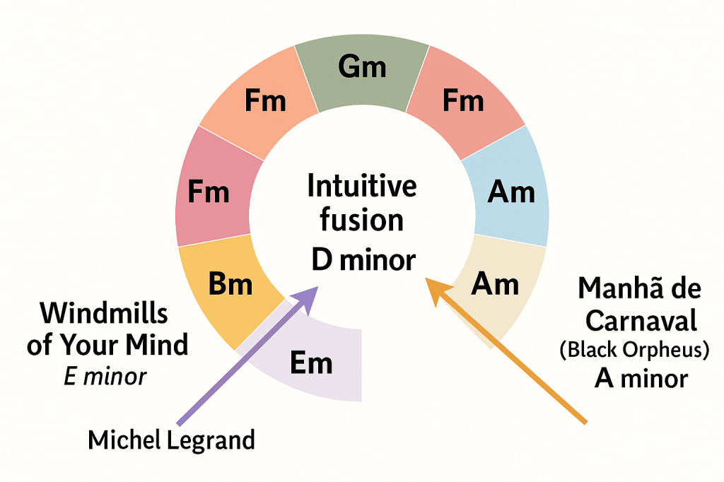 E minor (Legrand) and A minor (Bonfá) resolve naturally into D minor, the midpoint of longing — a harmonic reconciliation of mind and myth.