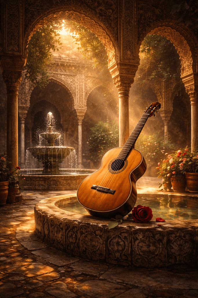 Memories of the Alhambra belongs to the latter. Built on the illusion of continuous sound, its tremolo line creates motion without urgency β like water gliding over stone. The melody seems suspended, sustained beyond what a single instrument should be able to hold.