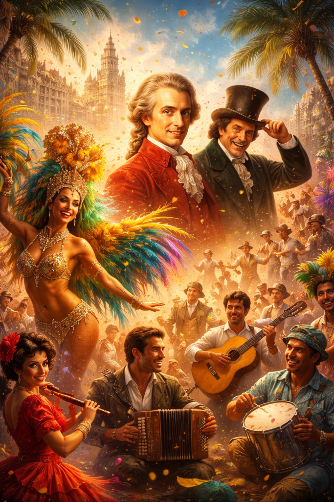 The transformation happened naturally. The Rondo loosened its formal posture. The samba gained structure. What emerged was not a mash-up, but a release — Mozart stepping out of the concert hall and into the street, without losing his identity.